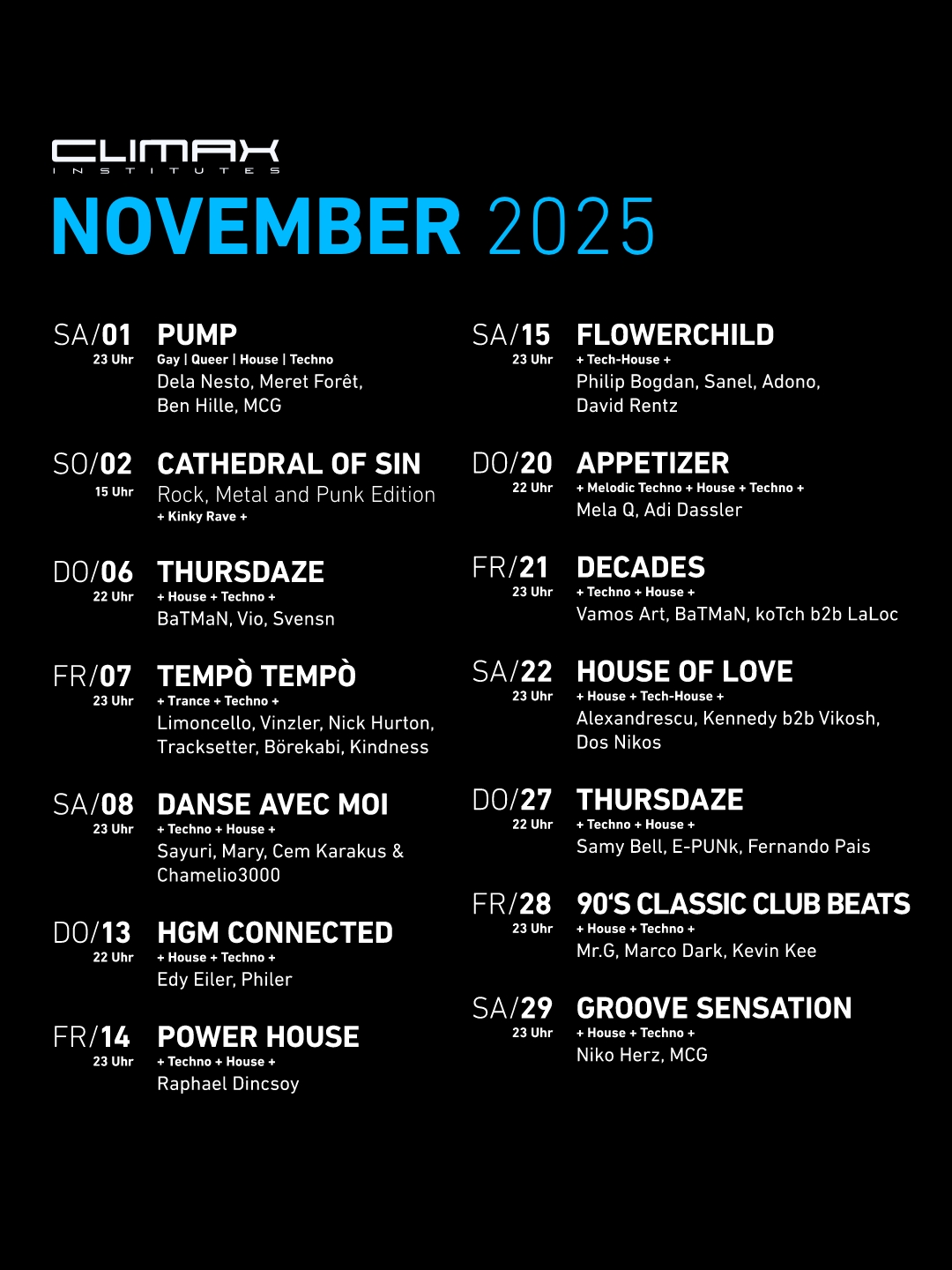 Der November spannt ein Feld zwischen Deepness, Direktheit und gemeinschaftlicher Präsenz. Das Climax bleibt ein Ort für elektronische Clubkultur in Stuttgart – offen, klar, konzentriert.