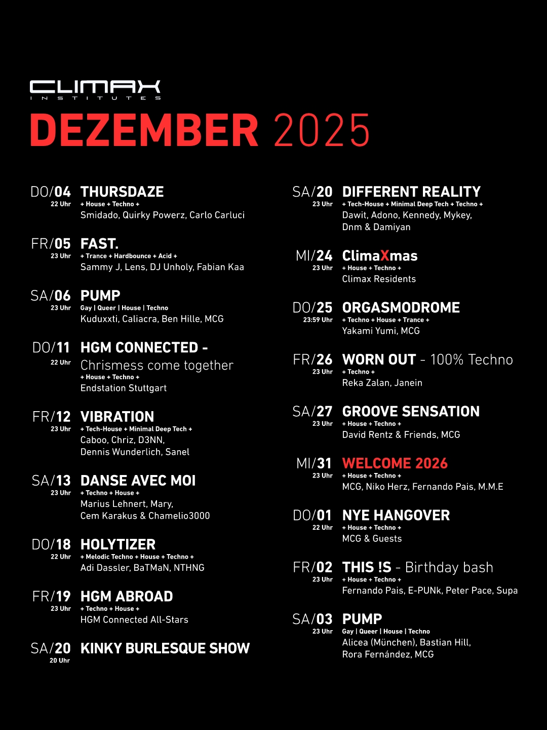 Clubprogramm Dezember 2025 Climax Institutes Stuttgart