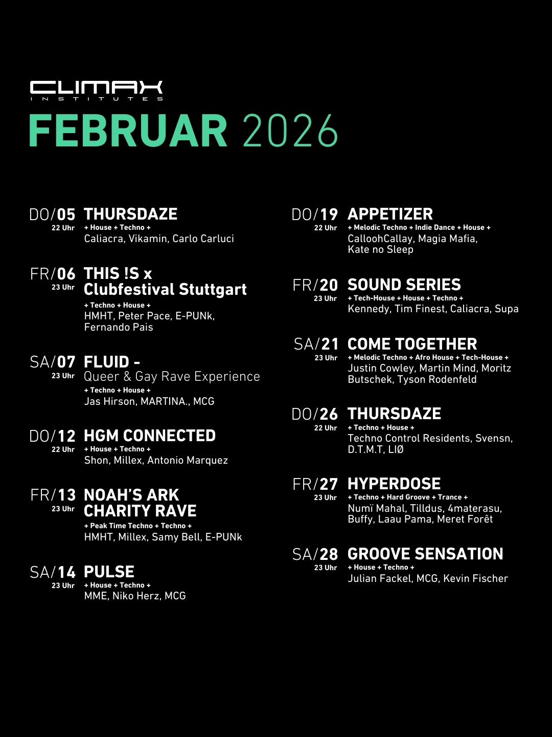 Im Februar zeigt das Climax ein breites Spektrum elektronischer Clubmusik. Donnerstage öffnen Raum für neue Handschriften, Freitage konzentrieren sich auf technoide Ausrichtungen, Samstage verbinden unterschiedliche Szenen und musikalische Ansätze. Dazu der neue Queer & Gay Rave FLUID (OPENING 07.02.).