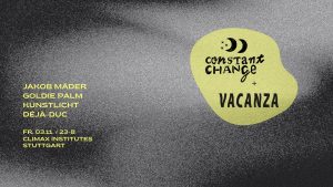Constant Change tut sich mit Vacanza aus Leipzig zusammen und lädt die beiden dazugehörigen DJs kunstlicht und Goldie Palm nach Stuttgart ein. Vacanza ist seit 2021 fester Bestandteil der Leipziger Club Landschaft und steht für ein breites Spektrum von Disco, House, Indie Dance bis Trance, Acid und Techno. Mit Déjà-Duc ist außerdem noch ein aufstrebender Stuttgarter DJ mit im Programm, der am 3.11. sein Climax Debut feiern wird. Last but not least ist natürlich auch Constant Change Gründer Jakob Mäder mit dabei. Eine spannende Kombination also und definitiv voller voller musikalischer Neuentdeckungen.