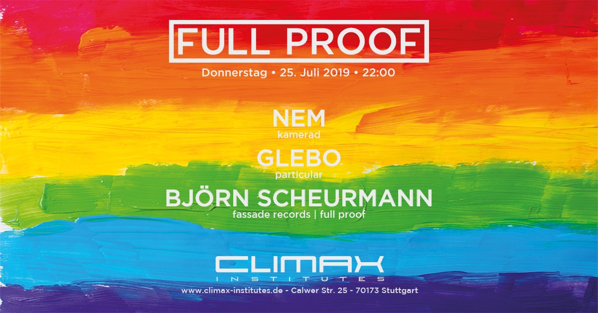 Im Climax wird das CSD-Wochenende bereits donnerstags eingeläutet und Full Proof – Macher Björn Scheurmann präsentiert mit NEM und Glebo zum Auftakt gleich ein musikalisches Highlight! Beide sind in der lokalen Szene keine unbekannten Protagonisten und während NEM mit seiner Event-Reihe „Kamerad“ von sich reden macht, ist Glebo bereits seit Jahren eine feste Konstante im Stuttgarter Nachtleben. Mit perkussiven Tech-House über groovigen Techno bis zu sexy House-Music stehen die Protagonisten für facettenreiche Playlists ein, überzeugen durch ihre Mixing-Skills und wissen stets die feierwütige Crowd in ihren Bann zu zeihen.