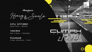 Der Tanz in den Tag der Deutschen Einheit bekommt ein gut klingendes Upgrade – und zwar in Form von HERZ & SEELE! Die quietschfidele Partyreihe für erstklassige elektronische Musik mit strenger Qualitätskontrolle bittet in dieser Nacht nämlich auch im Climax zum Tanz! Dort wird HERZ & SEELE das zelebrieren, was zählt: exzellente Musik von sympathischen Acts, eingebettet in eine familiäre Atmosphäre. Die Musik kommt diesmal von Lily Lillemore, die als Resident DJ im legendären Münchner Club Harry Klein regelmäßig zum Ausflippen bringt, sowie von tim|bre und Clochard!