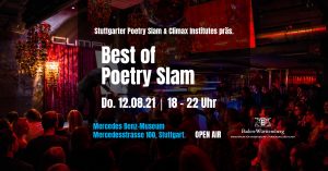 Die Stuttgarter Veranstalter „Sprechstation – Stuttgarter Poetry Slam“ (Veranstalter u. a. der Poetry Slam im Keller Klub und in der Rosenau) laden in Kooperation mit dem Climax Institutes die besten und erfolgreichsten Wortkünstler im deutschsprachigen Raum zur gigantischen Dichterschlacht – beim „Best Of Poetry Slam“.